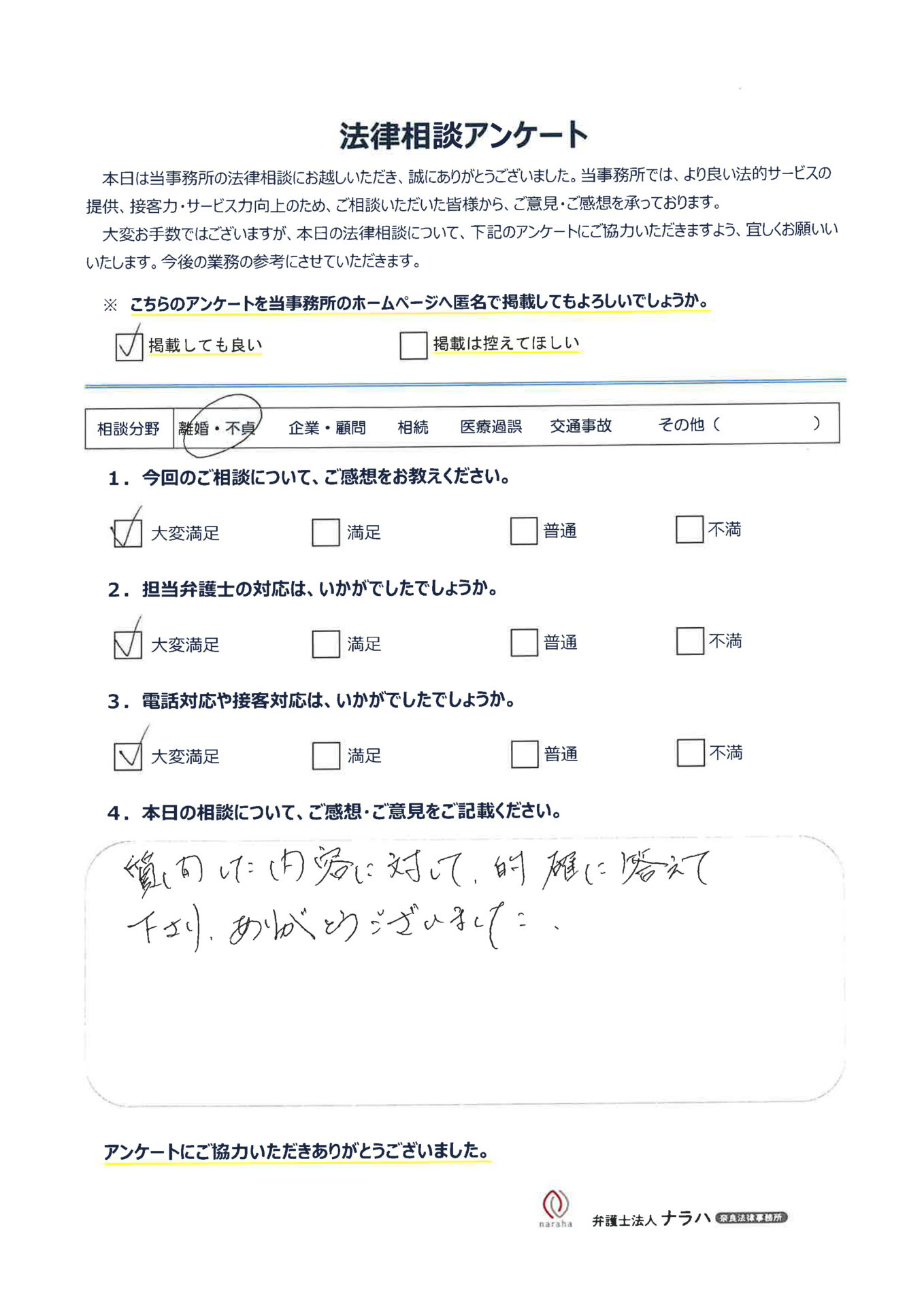 離婚相談に詳しい奈良の弁護士ならナラハ奈良法律事務所 TOP > お客様の声 > 「お客様の声」(105)