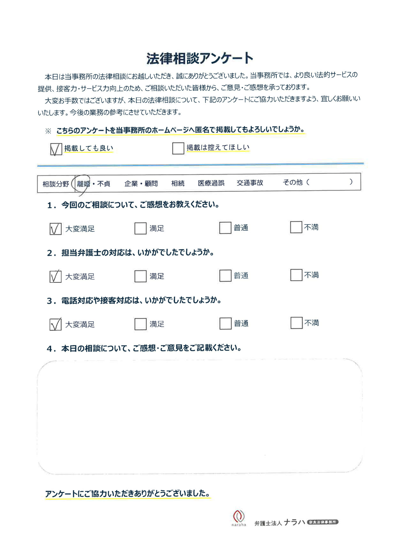 離婚相談に詳しい奈良の弁護士ならナラハ奈良法律事務所 TOP > お客様の声 > 「お客様の声」(110)