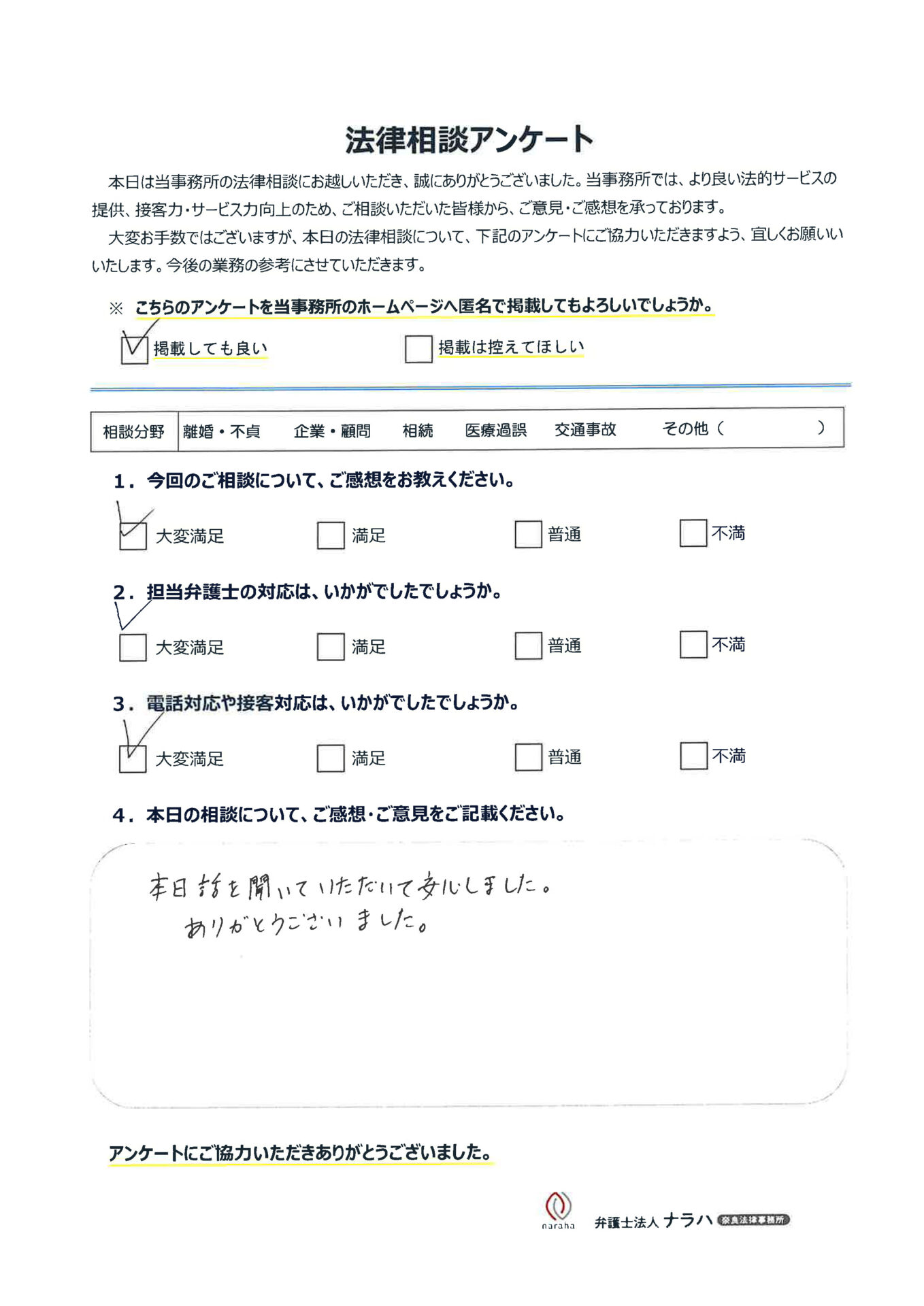 離婚相談に詳しい奈良の弁護士ならナラハ奈良法律事務所 TOP > お客様の声 > 「お客様の声」(115)