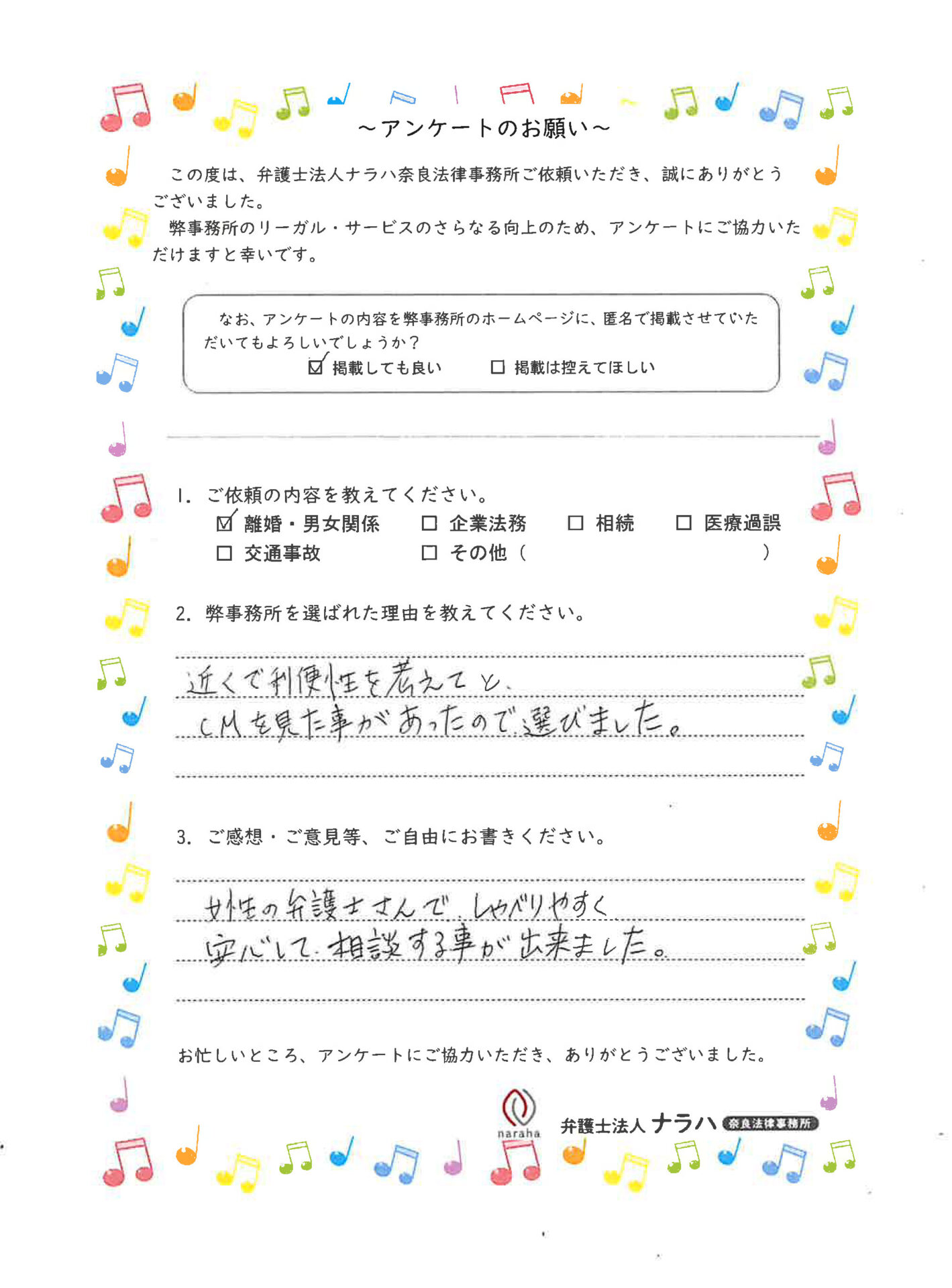 離婚相談に詳しい奈良の弁護士ならナラハ奈良法律事務所 TOP > お客様の声 > 「お客様の声」(119)