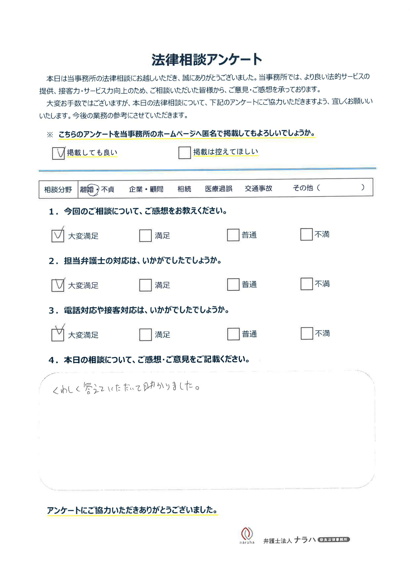 離婚相談に詳しい奈良の弁護士ならナラハ奈良法律事務所 TOP > お客様の声 > 「お客様の声」(123)
