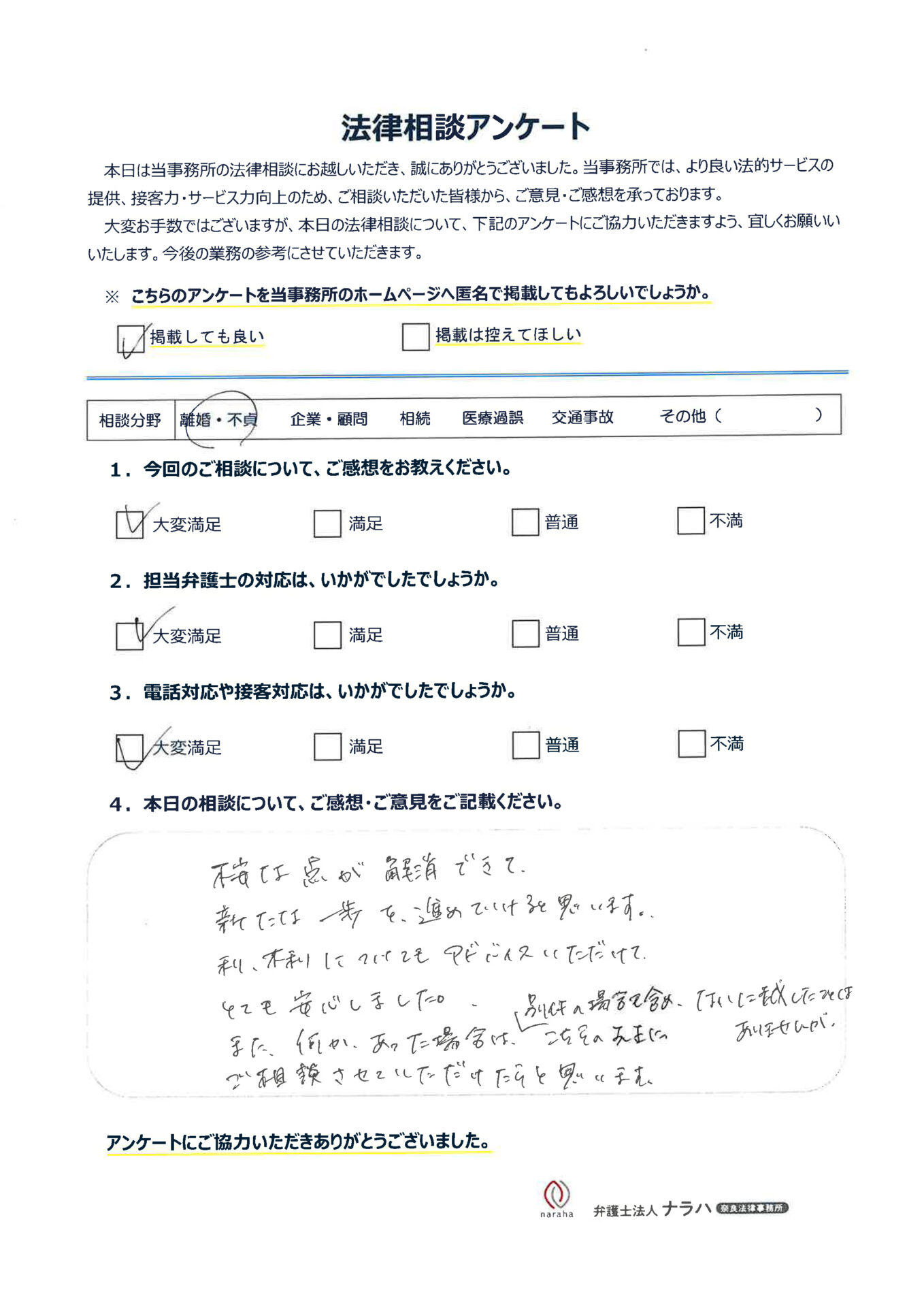離婚相談に詳しい奈良の弁護士ならナラハ奈良法律事務所 TOP > お客様の声 > 「お客様の声」(129)