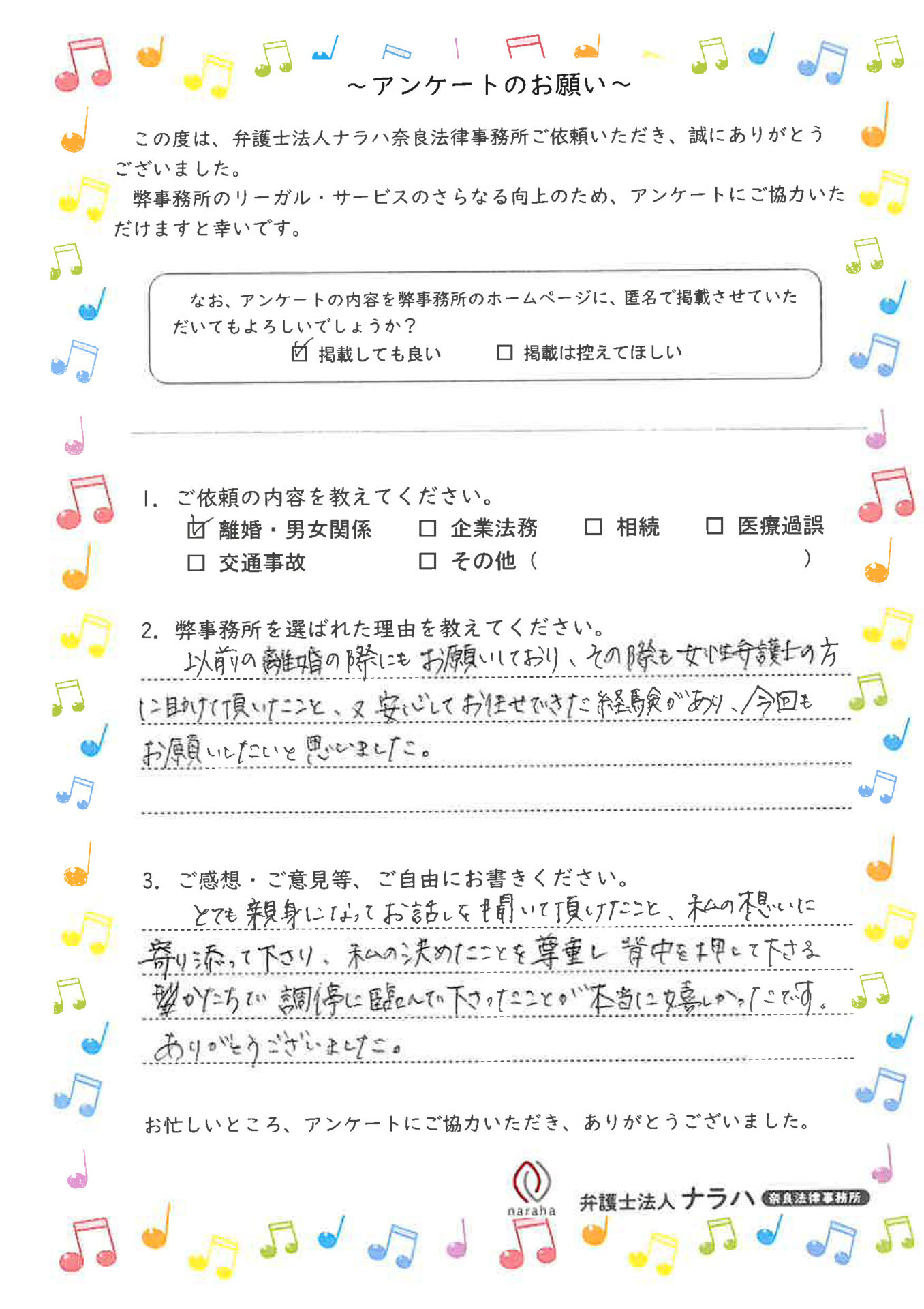 離婚相談に詳しい奈良の弁護士ならナラハ奈良法律事務所 TOP > お客様の声 > 「お客様の声」(133)